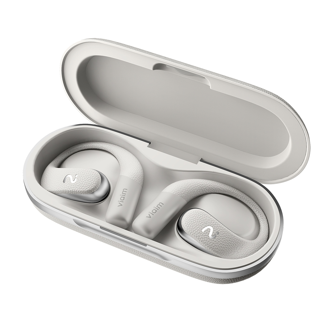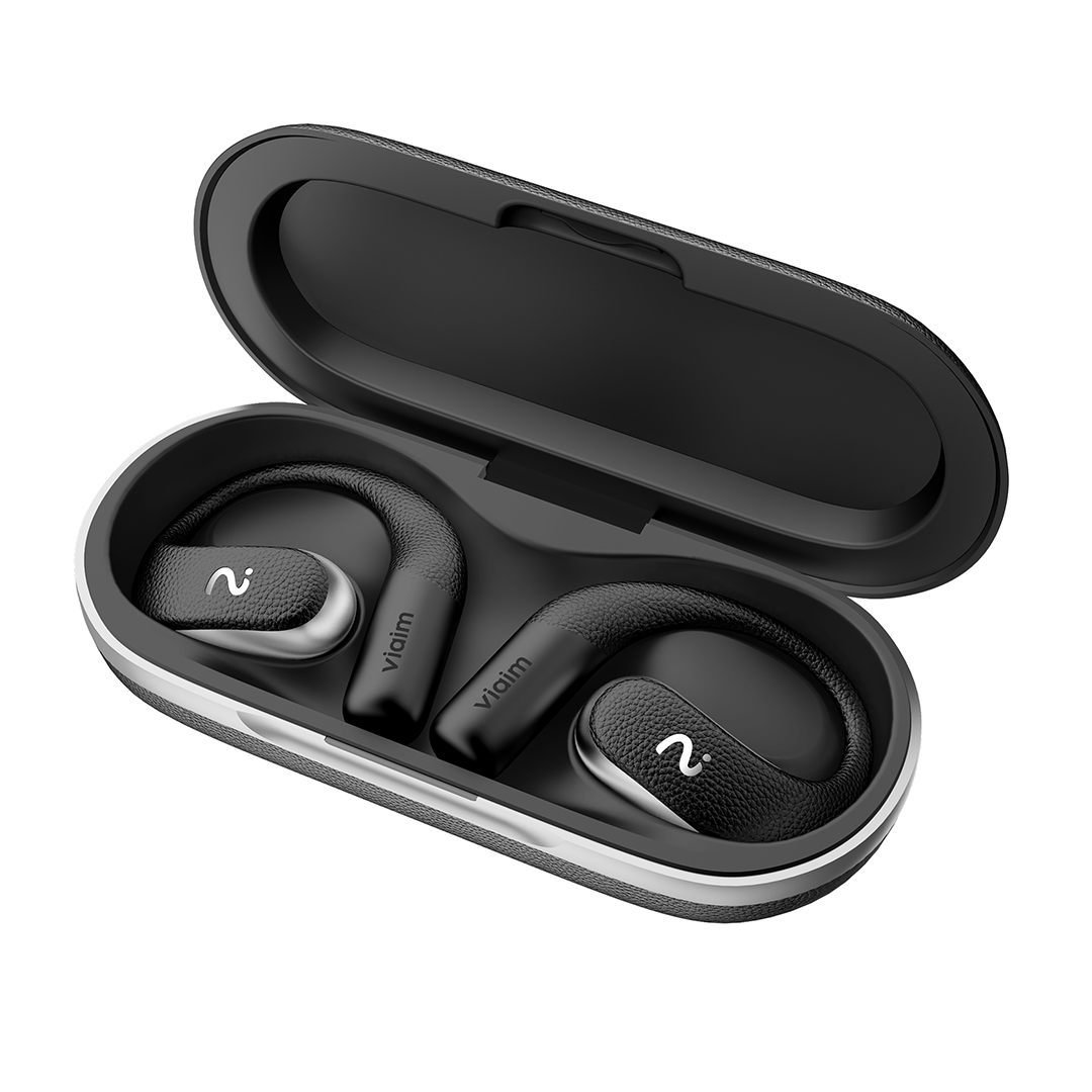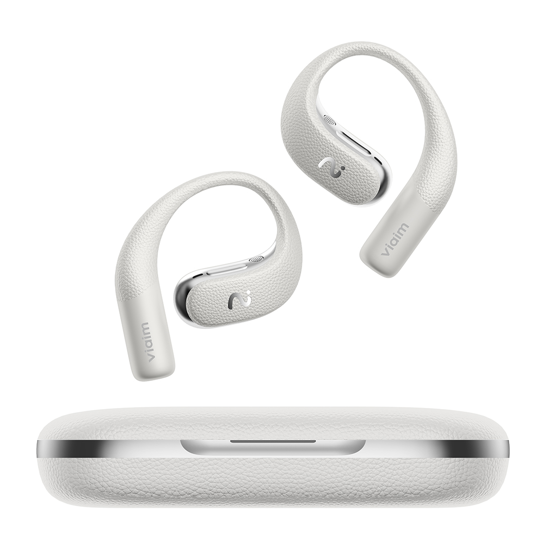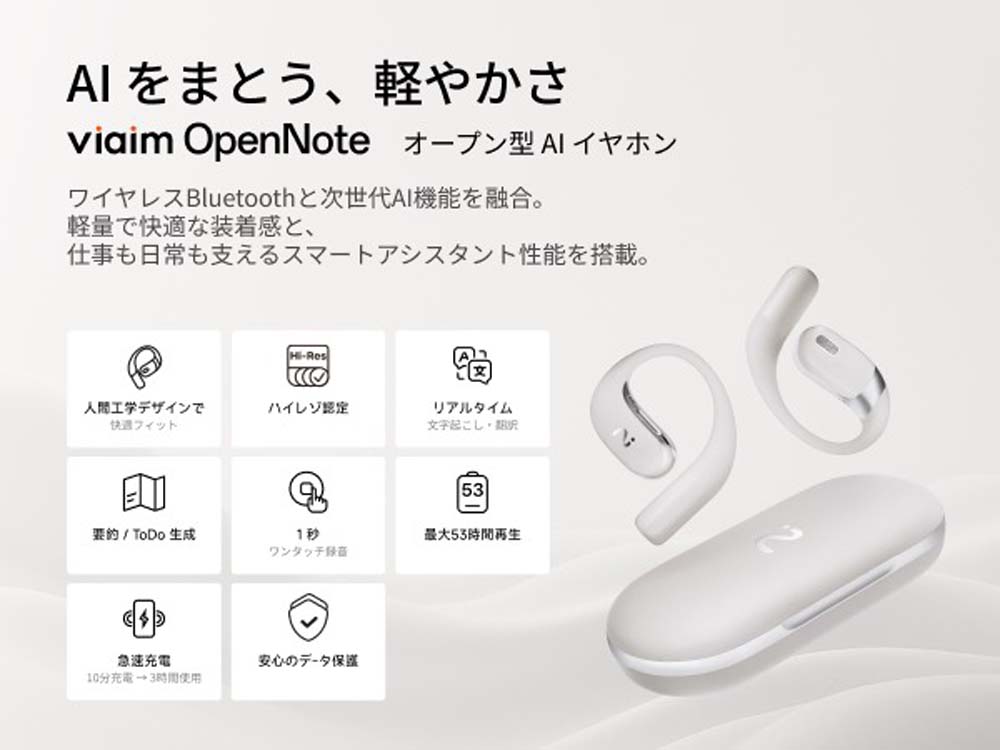 「viaim OpenNote」は、耳をふさがずに装着できるオープンイヤー型次世代AIイヤホンです。