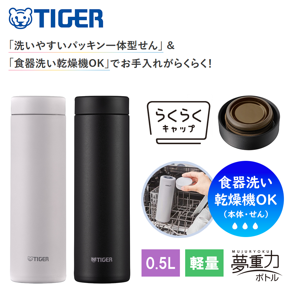 お手入れも、持ち運びも“らくらく”に タイガー魔法瓶 真空断熱ボトル MMZ-W501 0.5L 「洗いやすいパッキン一体型せん」&「食器洗い乾燥機OK」でお手入れがらくらく! パッキンの着脱をしなくてもいいからつけ忘れやつけまちがい、紛失の心配いらず。 ◆お手入れ“らくらく”簡単キレイ ボトルキャップ(せん)は1パーツのシンプル構造でお手入れ簡単、さらにボトルまるごと食器洗い乾燥機OK。 洗いやすさにこだわったらくらくキャップ パッキンとせんが一体化した「らくらくキャップ」で手間なく洗えます。パッキン部分は露出していてスポンジが当たりやすくお手入れしやすい構造です。 食器洗い乾燥機OK せん・本体ともに食器洗い乾燥機に対応。お手入れがさらにらくになりました。 ※画像はイメージです。