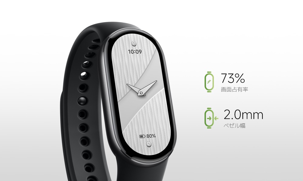 1.72インチの有機EL(AMOLED)大画面ディスプレイに、真空封止技術によりわずか2.0mmの左右対称な極薄ベゼルを実現、高級感あふれる新型スクリーンが登場。スクリーンの画面占有率は65.6%から73%へと大幅に向上し、表示エリアは前世代比で+11%拡大。視認性がさらに高まりました。また、ディスプレイの明るさは前世代比で25%アップし、最大1500nitsの輝度によって、直射日光の下でもメッセージや通知がはっきりと読み取れます。