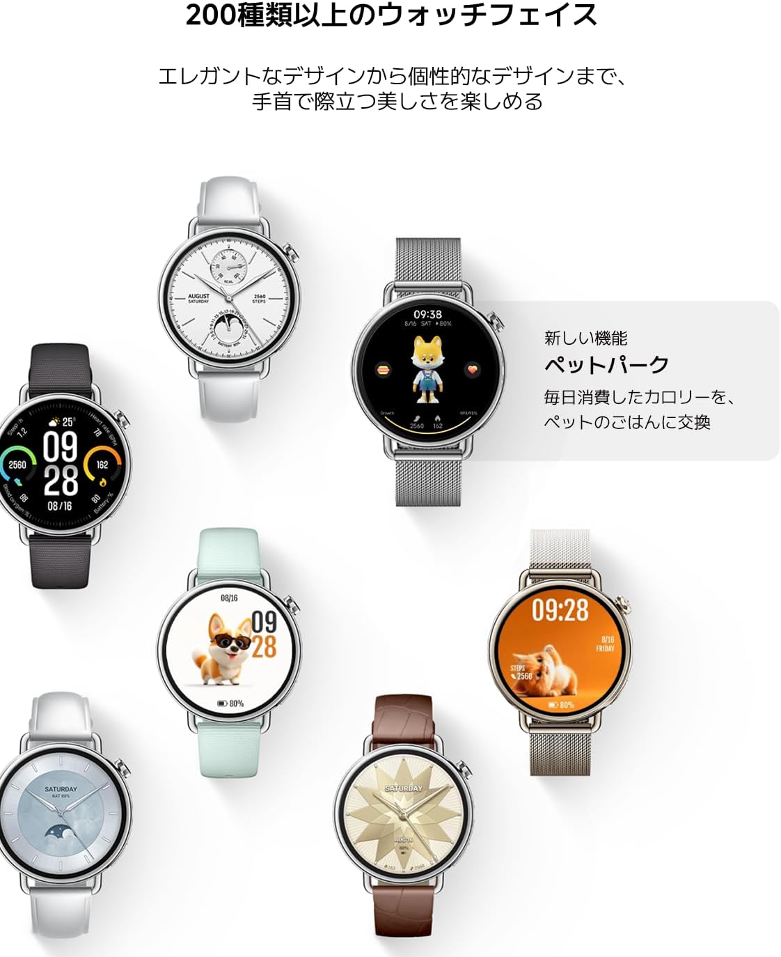 200種類以上のウォッチフェイスから選んで、自分らしいスタイルを演出。エレガントなデザインから個性的なデザインまで、手首で際立つ美しさを楽しめます。かわいい動物ウォッチフェイスも搭載されており、日常に可愛らしさと遊び心をプラスします。