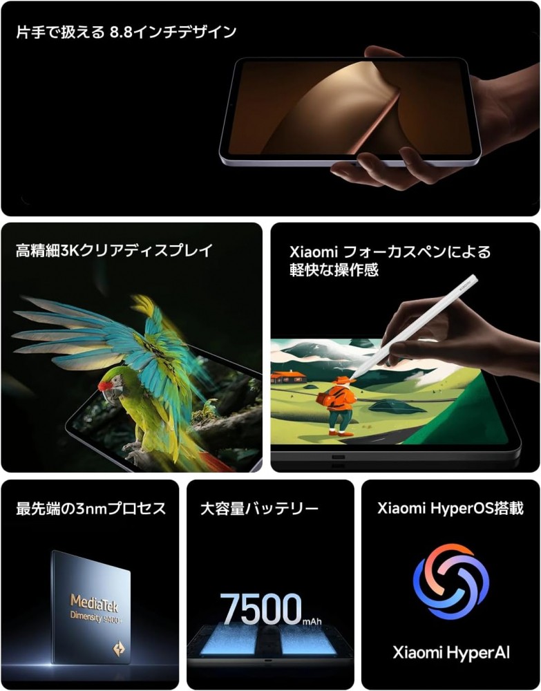 Xiaomi Pad Miniは、先進的なMediaTek Dimensity 9400+チップセットを搭載しています。最先端の3nmプロセスにより、強力かつ高効率なパフォーマンスを実現します。高度なNPUを備え、AIによる画像処理、音声認識、スマート推論機能を大幅に強化し、日常の作業をよりスマートかつ効率的にします。