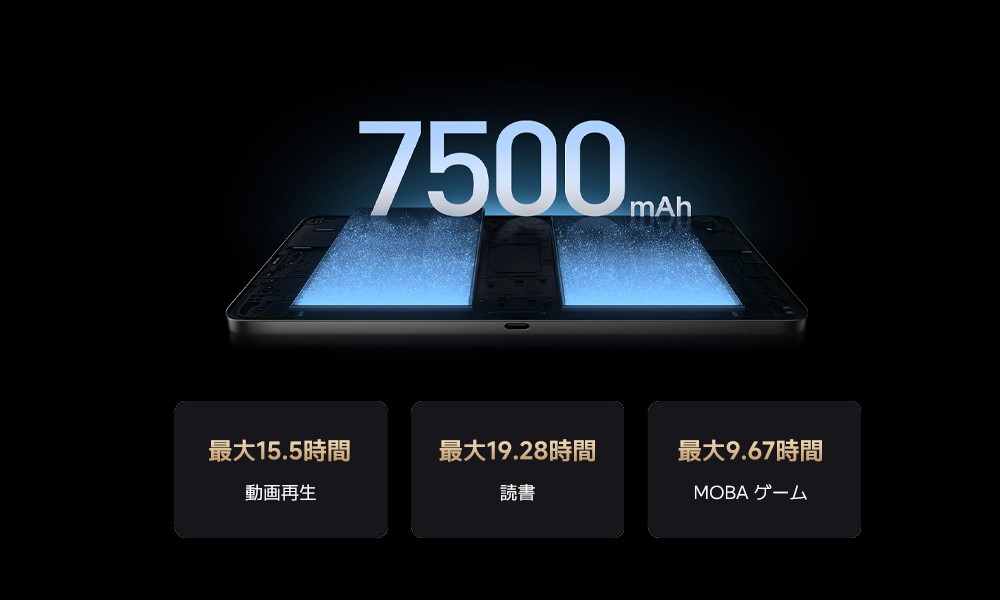 Xiaomi Pad Miniは革新的なデュアルバッテリーデザインを採用し、コンパクトなボディに2つのバッテリーを巧みに搭載することで、7500mAh(typ)の大容量を実現しています。この強力な電源により、オンライン会議、ドキュメント編集、マルチタスクなど、外出先でも長時間の作業を安定して途切れることなく行うことができ、頻繁な充電の煩わしさから解放されます。