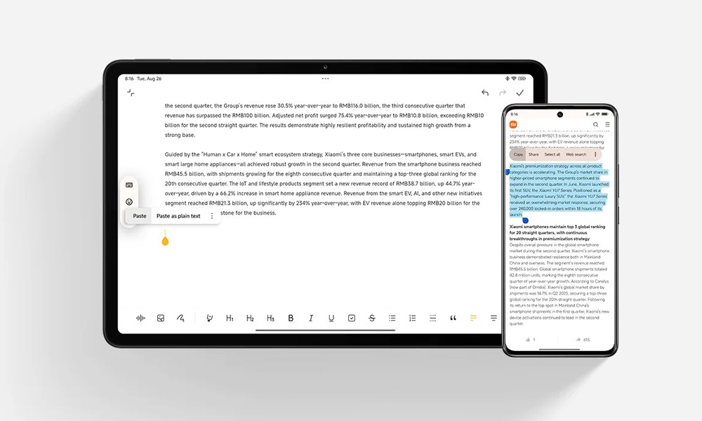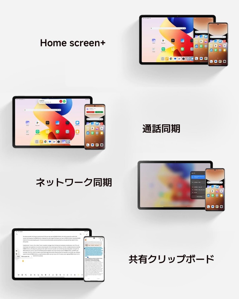 REDMI Pad 2 ProからXiaomiスマートフォンを直接操作でき、スマートフォンのアプリやファイルを利用できます。スマートフォンのアプリをPadにピン留めしてに使用することも可能です。