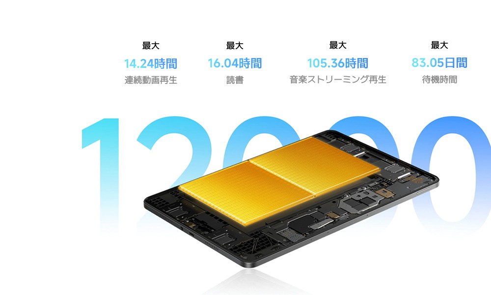 REDMI Pad 2 Proは大容量の12000mAh(標準値)バッテリーを搭載し、長時間にわたりお気に入りのコンテンツを楽しめます。バッテリー残量を気にする必要はありません。