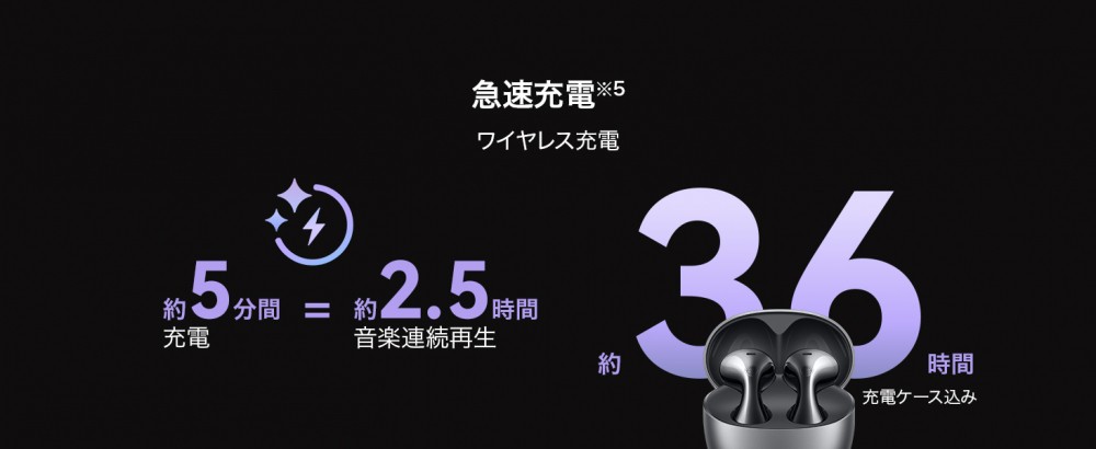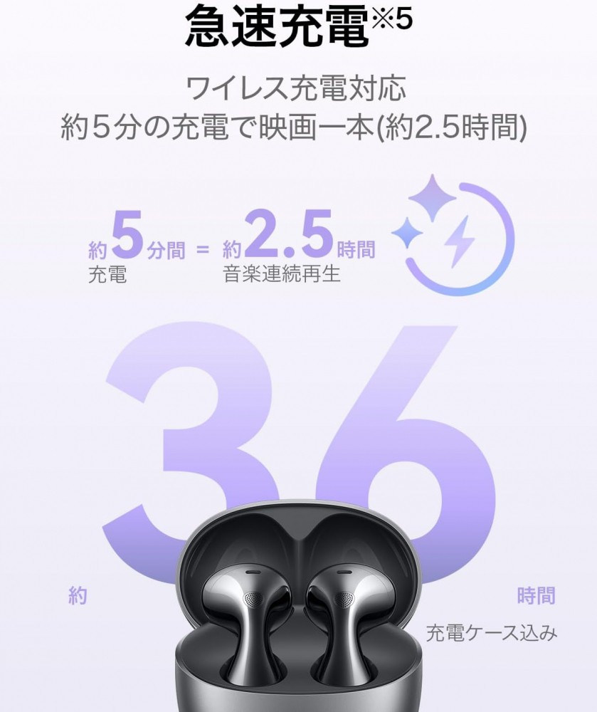 イヤホン単体で最長4.5 時間(ANCあり)または最長6時間(ANCなし)、充電ケースと組み合わせれば最大36 時間の音楽連続再生が可能です。さらに、超急速充電に対応。ワイヤレス充電対応。