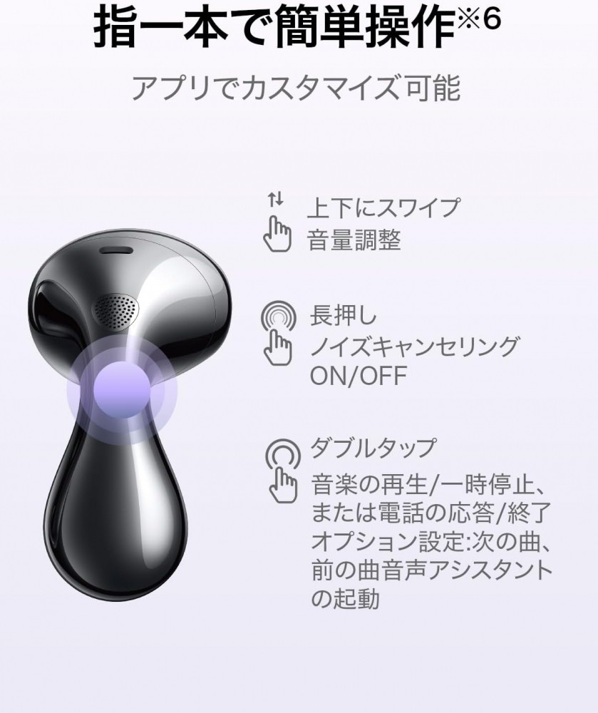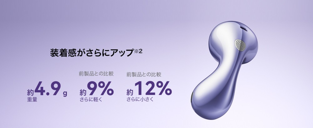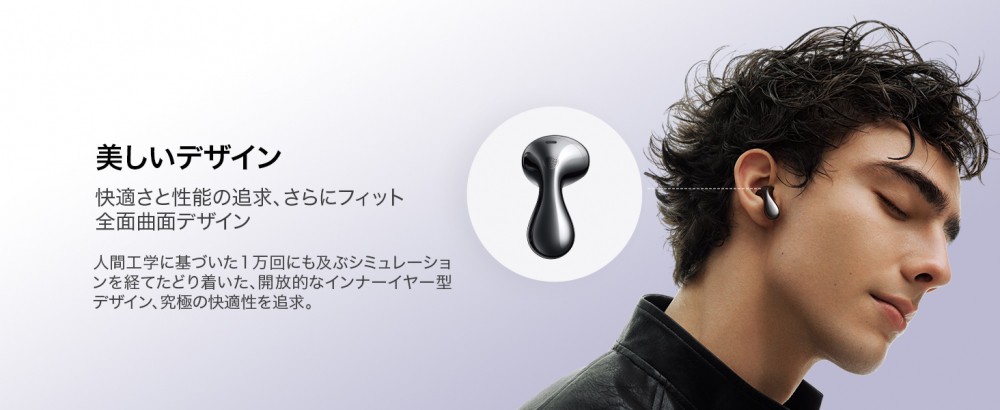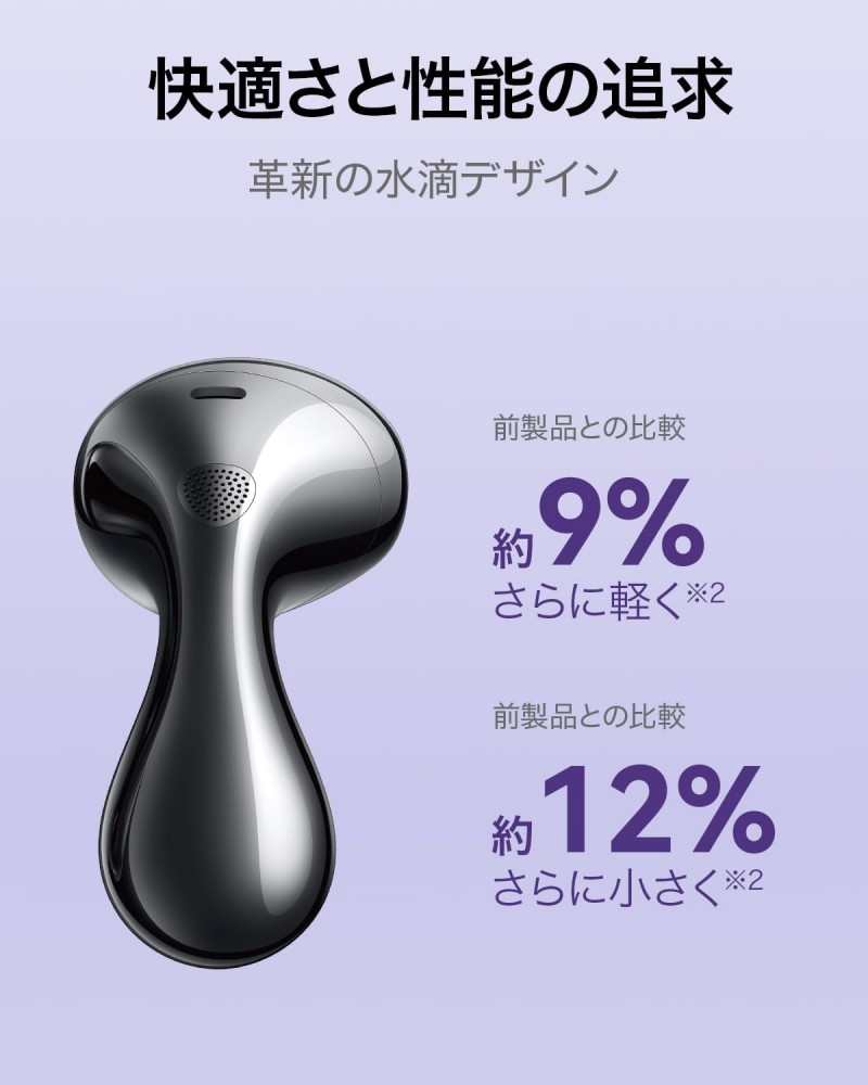 水滴を連想させる美しさで、近未来感のあるユニークな形状です。前モデルからイヤホン本体が約9%軽く、約12%小さくなり、長時間でもより快適にご使用いただけるようになりました。人間工学に基づいて約1万回のシミュレーションを経て設計されたインナーイヤー型イヤホンとなっていますので、耳栓のようなカナル型の着用感が苦手な方も快適にご使用いただけます。さらに付属のイヤーチップを使えば、フィット感の調整も可能です。