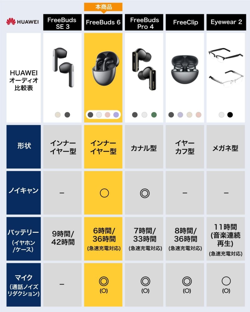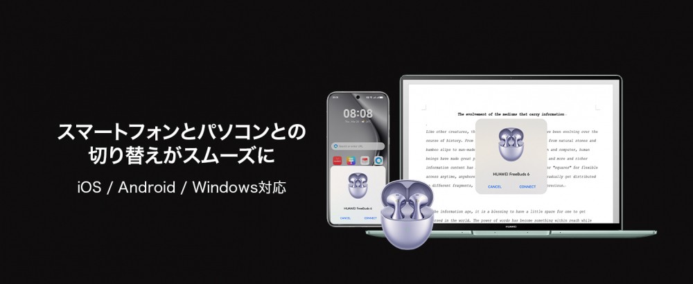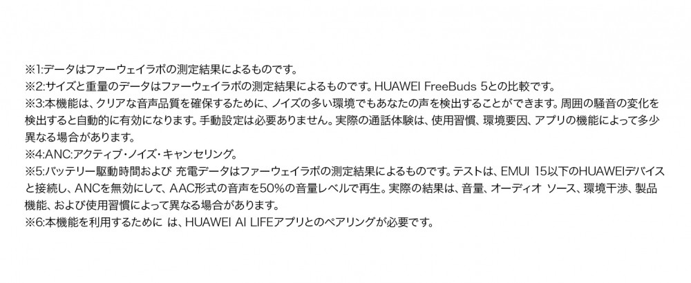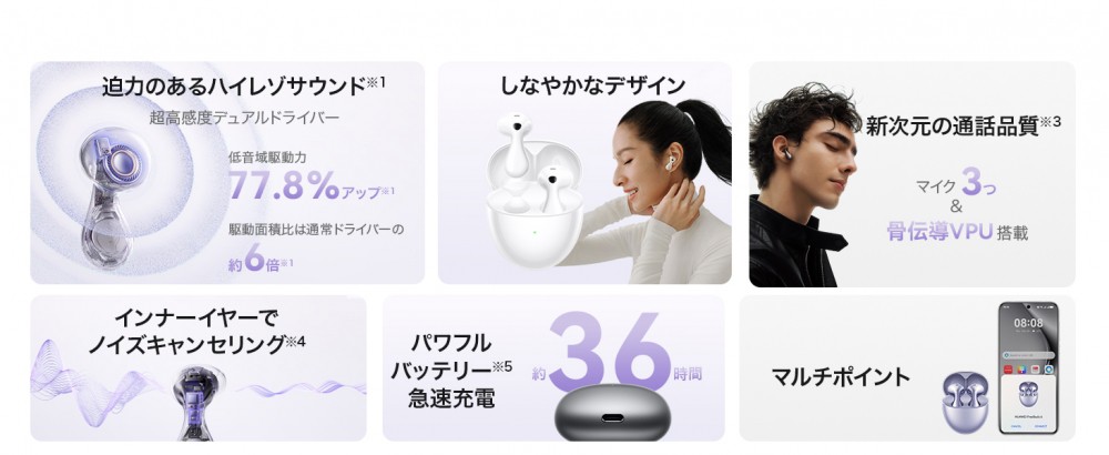 HUAWEI FreeBuds 6は、根強い人気のインナーイヤー型シリーズ『HUAWEI FreeBuds 5』の後継機です。前モデルから引き続き、アイコニックな水滴デザインを採用。見た目の美しさだけでなく、人間工学に基づいた1万回にも及ぶシミュレーションを経た快適な着用感も持ち味です。前モデルと比較して、さらに小さく軽くなり、長期間着用しても疲れにくくなっています。前モデルからの最も大きな進化点として、ドライバーがフラッグシップ『HUAWEI FreeBuds Pro 4』と同様のデュアル構成となり、迫力ある低音は14Hzから、滑らかな高音は48kHzまで発することが可能です。また、騒がしい場所でもオンラインミーティングに参加できる強力な通話ノイズリダクション機能、耳を完全に塞がないインナーイヤー型ながらも搭載されたアクティブノイズキャンセリング機能、マルチポイント接続など、デザインもスペックも妥協のない1台です。