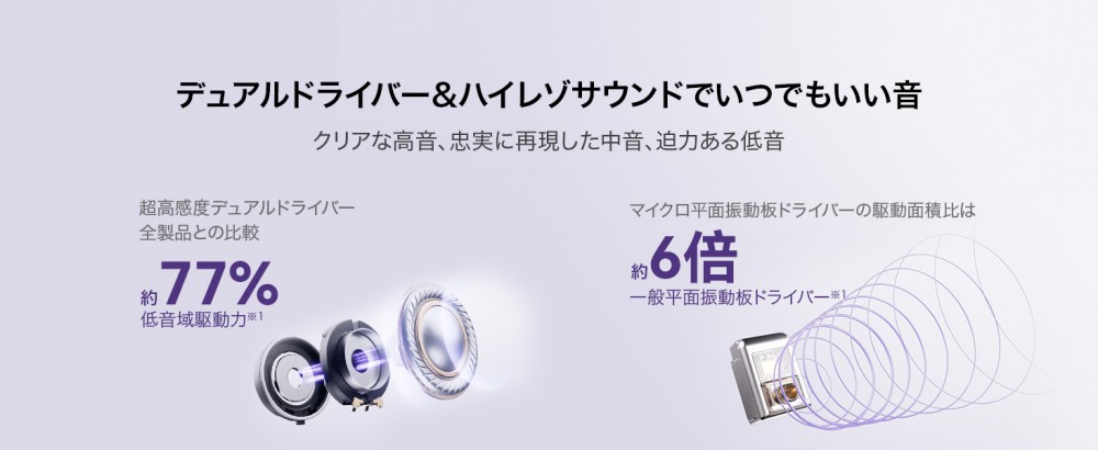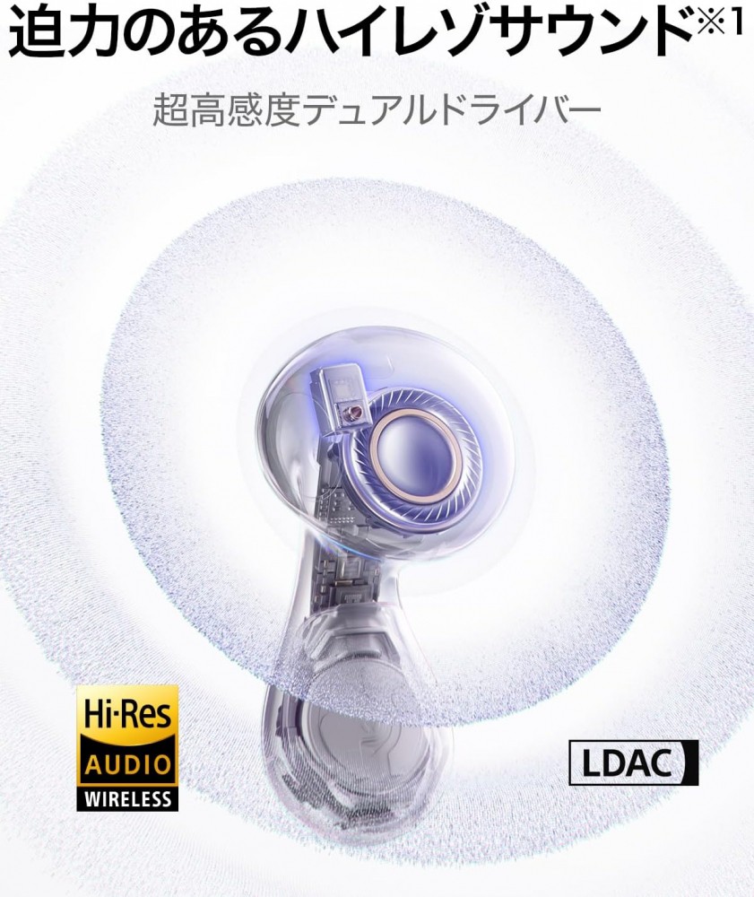 ダイナミックドライバーユニットに、独自開発のマイクロ平面振動板ドライバーユニットも加わり、幅広い再生周波数帯域を実現。迫力のある低音に加え、音楽をより解像度高く再現することができます。さらに、低音域の11mmのデュアルマグネットダイナミックドライバーを改良し低音域駆動力も向上。SBC、AAC、LDACに対応し、ハイレゾ認証を取得しています。