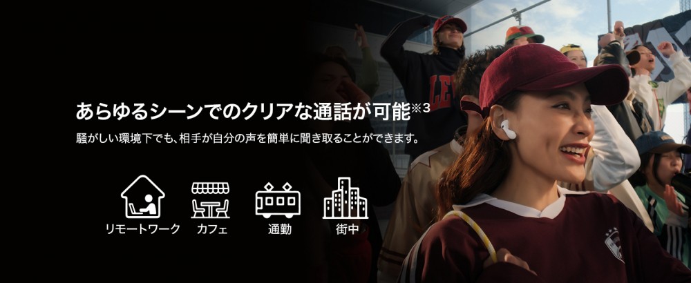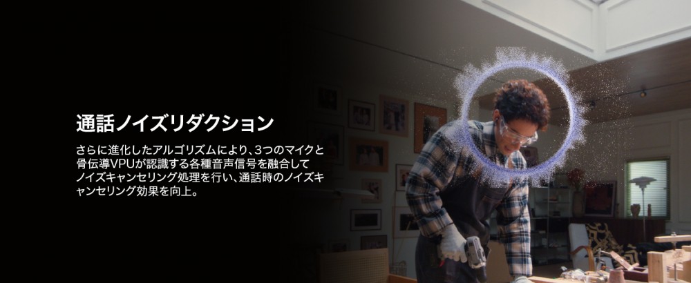 トリプルマイクに加えて、新たに骨伝導VPUセンサーを搭載し、通話ノイズリダクションがさらに進化。ディープニューラルネットワーク(DNN)アルゴリズムと指向性マイクで、AIが周囲の雑音と声を切り分けることを学習します。周囲の雑音が気になるカフェや電車のホーム、スタジアム、屋外など騒がしい環境下で通話をしていても、相手には安定したクリアではっきりとした声が届きます。
