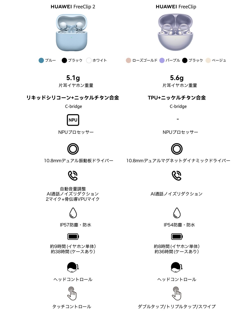 6.HUAWEI FreeClipとの比較です。全てのデータはファーウェイラボによる測定結果であり、製品サイズ、製品重量、関連仕様は、製品個体により若干異なる場合があります。実際の製品に準拠します。