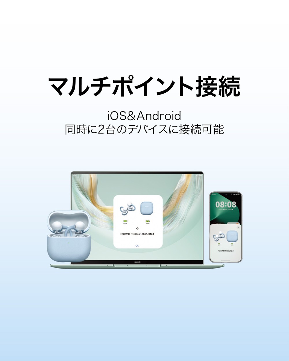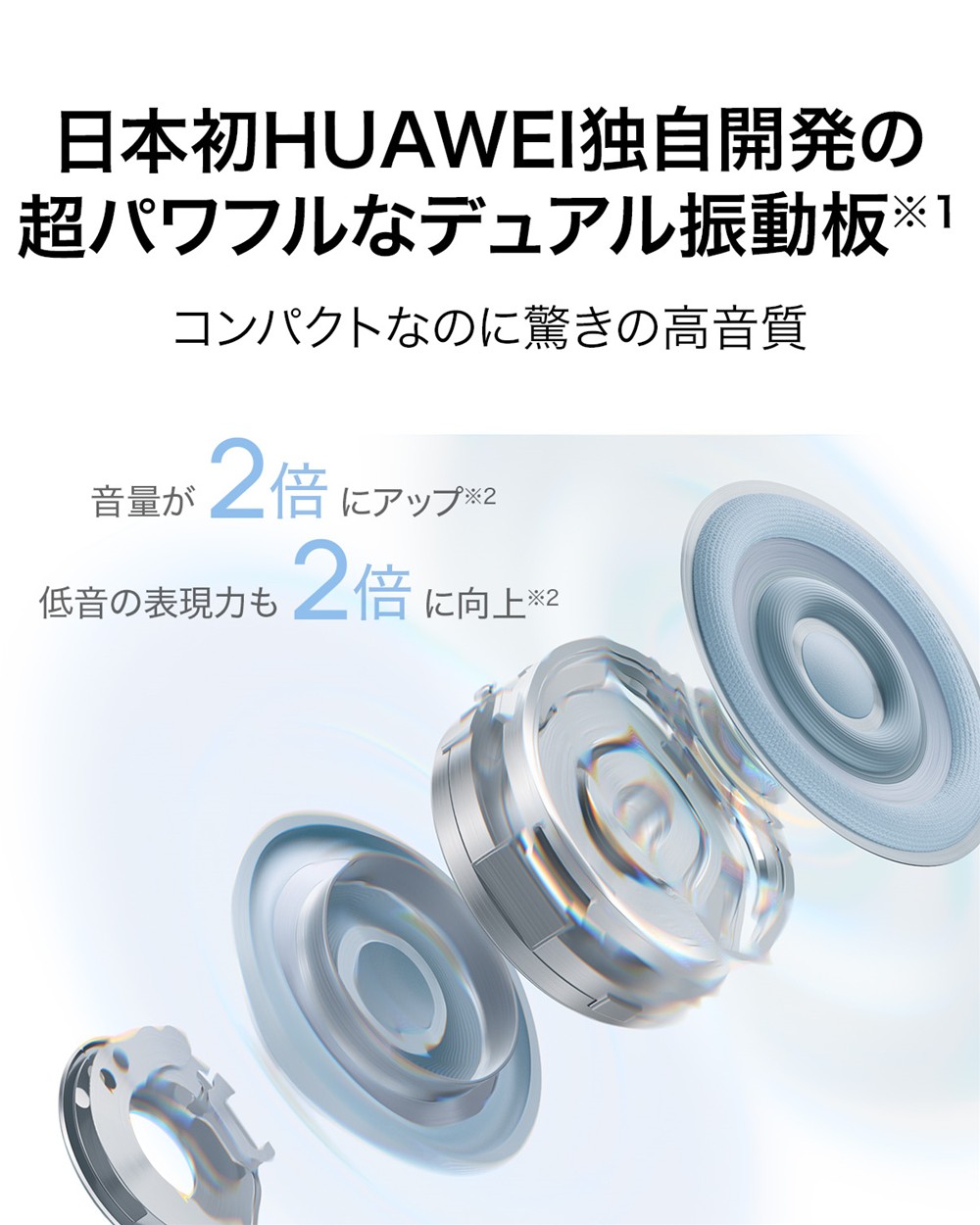 1.デュアル振動板ドライバーとは、HUAWEI FreeClip 2に搭載された、HUAWEI自社開発したふたつの振動板をもつダイナミック型ドライバーユニットを指します。2025年10月時点、当社による社内調査に基づく。