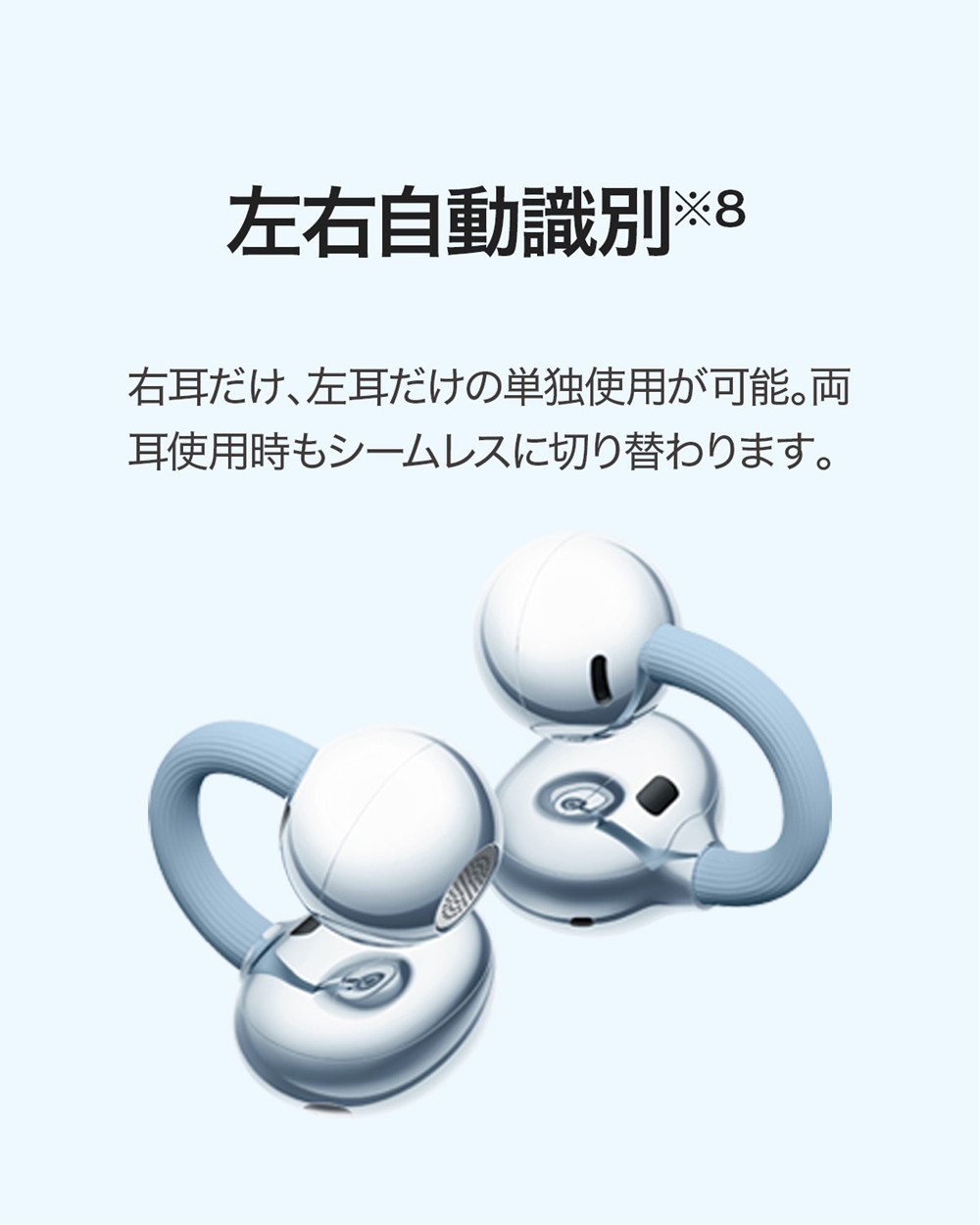 11.左右自動識別の精度は頭部の動きや姿勢に依存します。装着後は軽くうつむくことで精度が向上します。装着時間や姿勢などの要因により認識精度が変動する場合があります。実際の使用感は、使用習慣、装着状態によって異なる場合があります。実際の使用状況が優先されます。