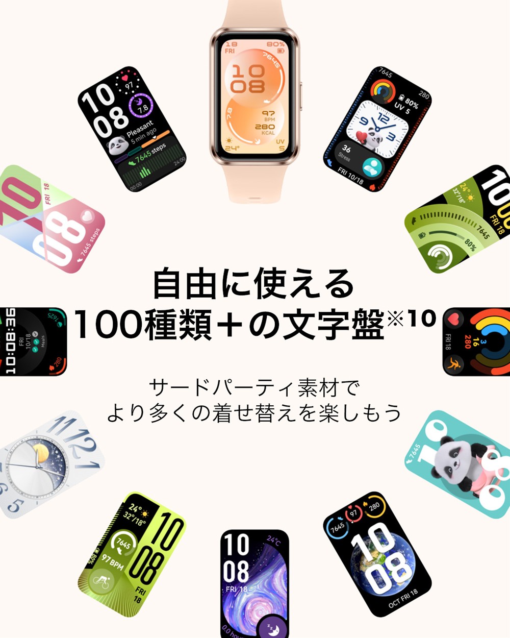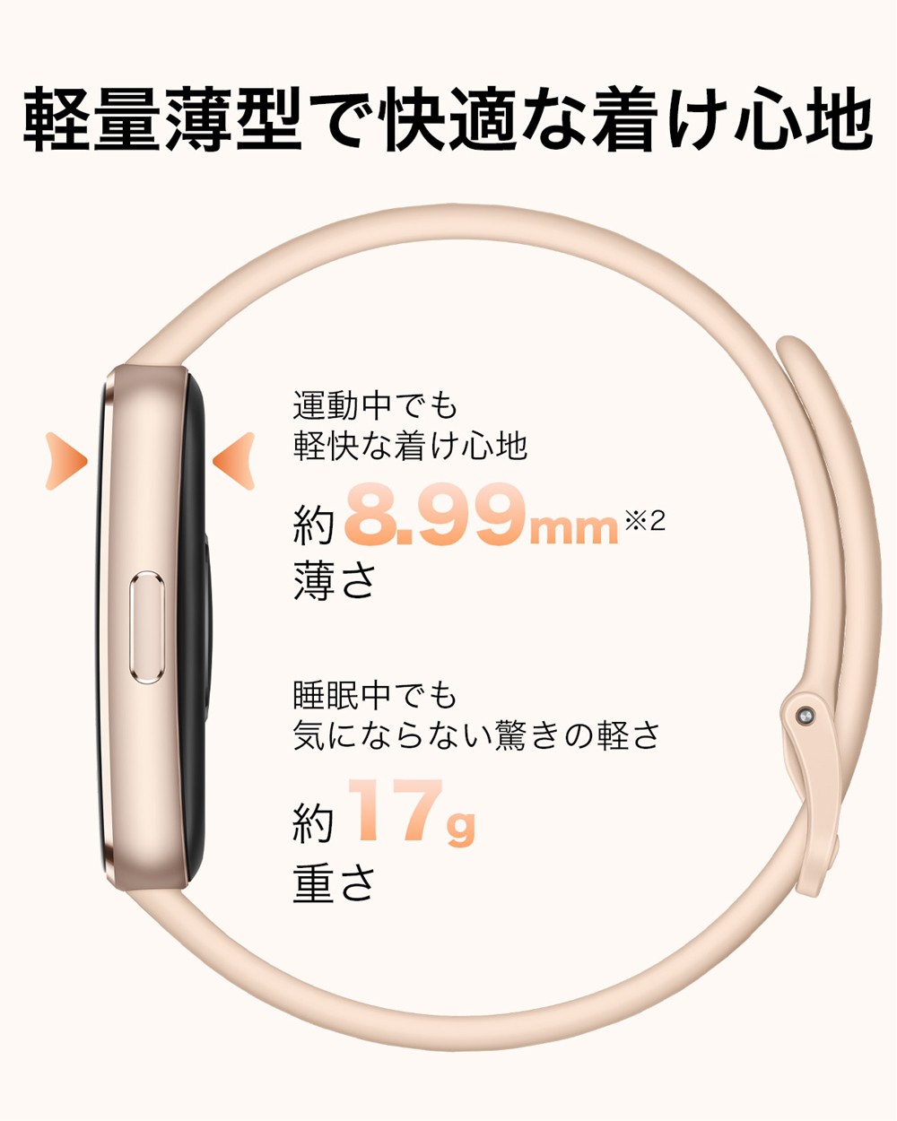 HUAWEI Band 11は重さは約17gで、着けていることを忘れてしまうほどの軽快さを提供。薄さ約8.99mmのCNC加工アルミニウム合金ケースを採用したこのフィットネストラッカーは、ファッション性と、空気のような自然な着け心地を提供します。約1.62インチ、60HzのAMOLED(有機EL)ディスプレイは、画面サイズが約27%拡大し、輝度は最大1500ニトと大幅に明るくなりました。強い日差しの下でも、すべての情報が一目でくっきりと確認できます。