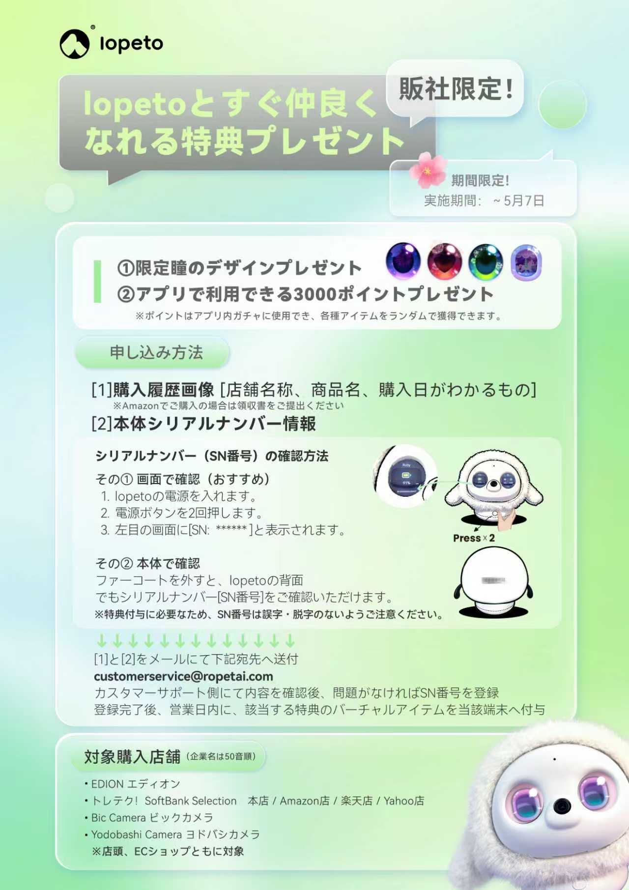 ・本物のようなぬくもり!ふわふわボディのAIロボットペット ・育てるほどに、愛着が湧く。4つの性格タイプから育む、あなただけの小さな相棒 ・ダンス・着せ替え・抽選ゲームも!?アプリ連携で楽しさ無限大 ※画像はイメージです。 ※ファーカラーはホワイトです。 「関連情報」Aiペット lopeto AI robot AIロボットペット MY-RTPT01 AI 感情 成長 ロボット ペット 癒し 人肌で温かい ふわふわ もふもふ 着せ替え ロペト ロペット 1年保証