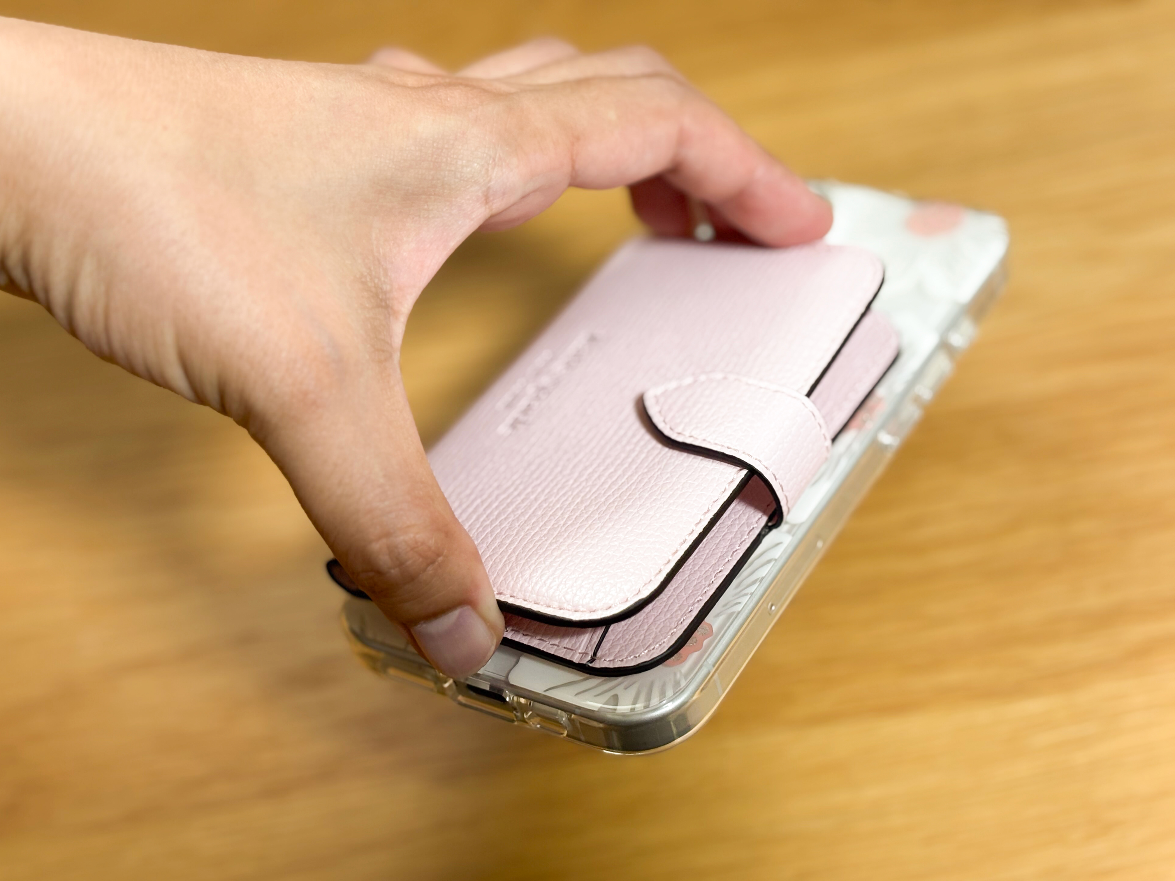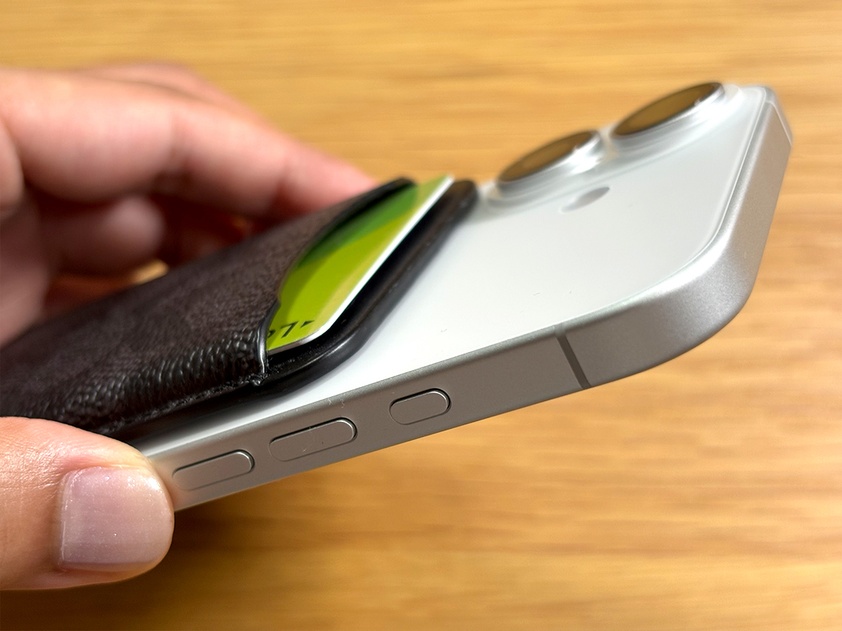 MagSafe部分としっかり吸着するので、ウォレットだけ掴んでみてもまったく外れません。試してみるまでこんなに吸着力があるとは思いませんでした。でも取り外しはスムーズ!