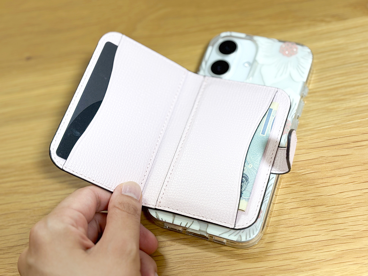 収納ポケットは、カードをいれるとポケット内でしっかりと固定されるため滑り落ちることもなさそう。反対側にお札を入れておけばもしもの時も安心ですね♪